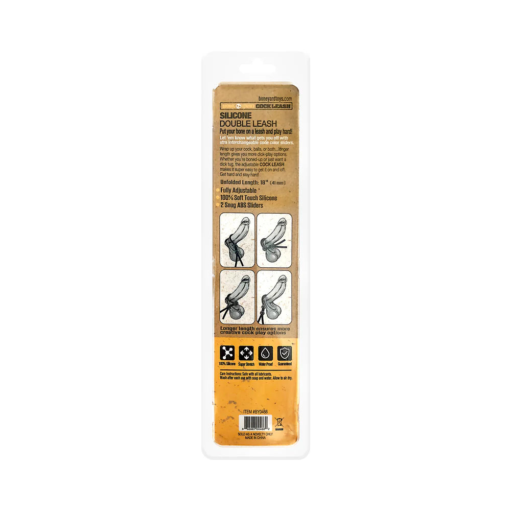 The Boneyard Cock Leash Double is the perfect cock ring, fully adjustable and easy to put on. The leash is 100% medical grade silicone. The 4 Hanky Coded ABS latches allow for endless adjustment possibilities, and the added hint of your fetish to the lucky guy that gets your clothes off.Black: BDSMYellow: WatersportsRed: FistingBlue: Likes to FuckThe beads also let you loosen of tighten the ring without the hassle of changing to a different ring and losing your stiffy. The Cock Leash Double fits around your shaft, your balls, or both.Fully Adjustable Silicone CordingHanky Code Color ABS LatchesPackage Dimensions: 11.5" x 3" x .5"Weight: 0.2 lbs